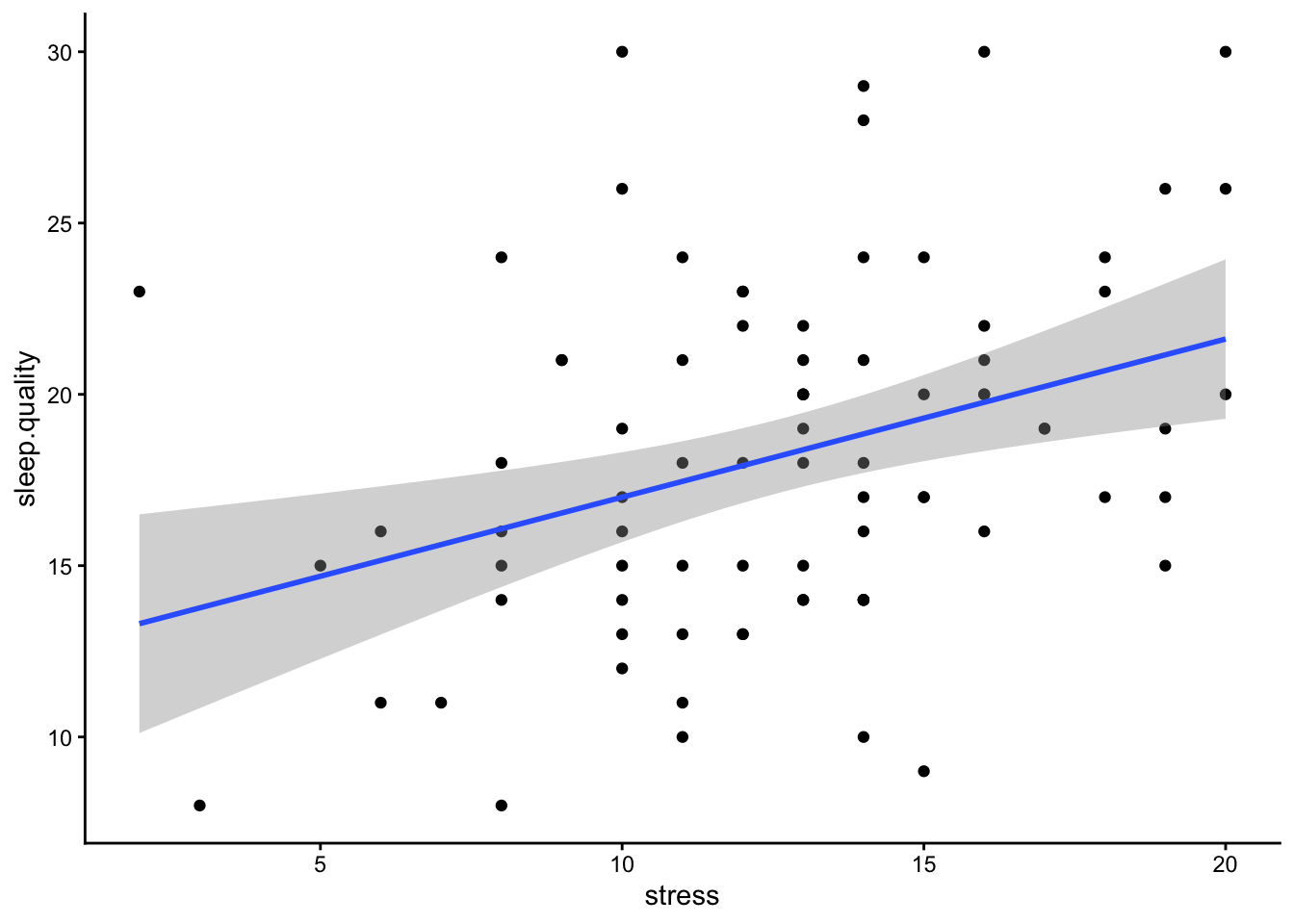 As discussed in the lecture, a correlation assesses the relationship between two continuous variables. In the example below, we will assess the association between stress levels and sleep quality. For more detail on the Perceived Stress Scale, click here. For more detail on the sleep quality scale, click here. Note that we have reversed-coded the sleep quality items so that higher scores mean higher sleep quality. Again, we will only be using a subset of the items from each scale.